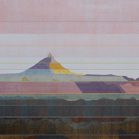 The multi-hued, banded strata, broad mesas, steep-sided canyons and stark badlands of the Colorado Plateau have a profound impact on my work. The initial layers are drawn directly from landscape elements, with the subsequent layers of color, texture and line transforming the work into its final abstract image.